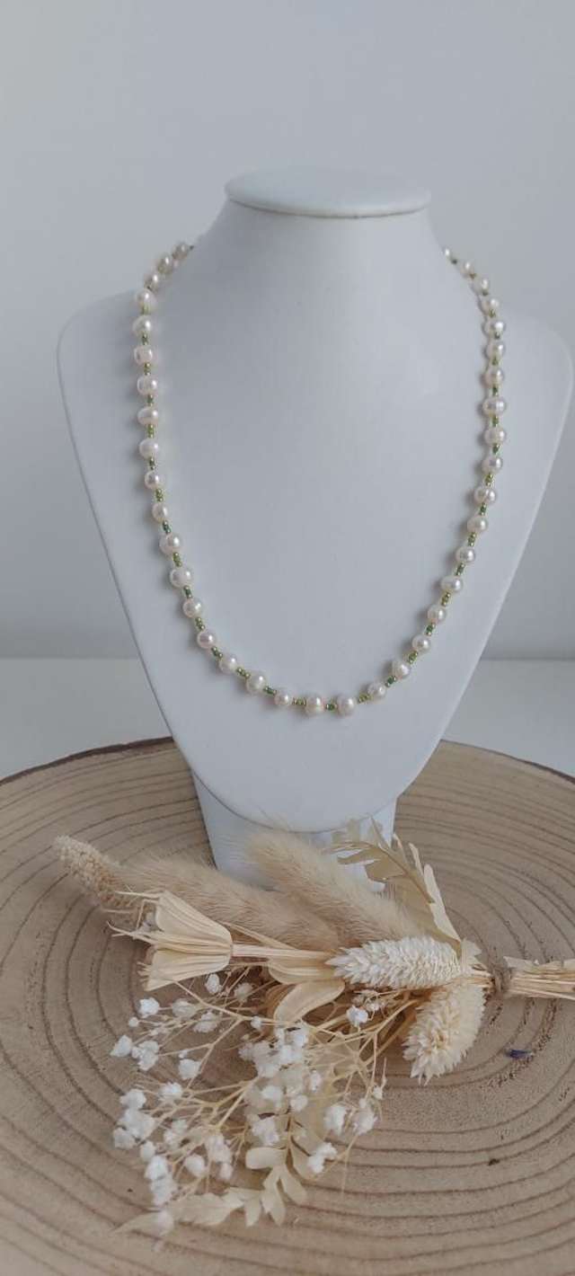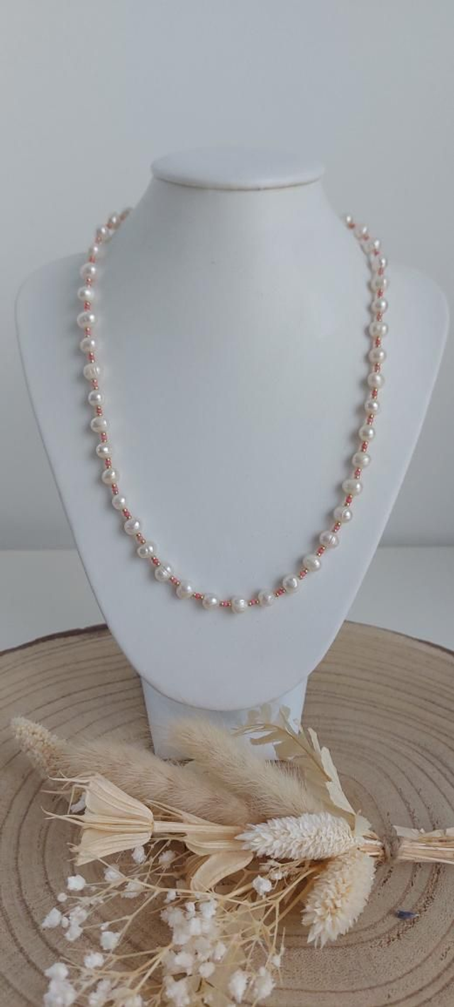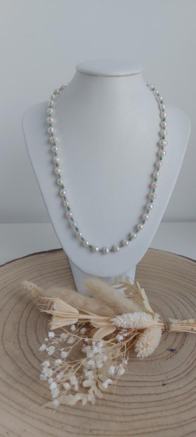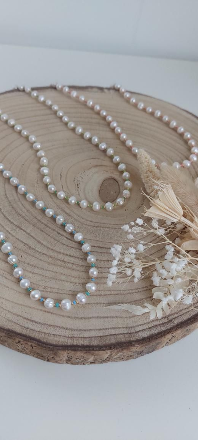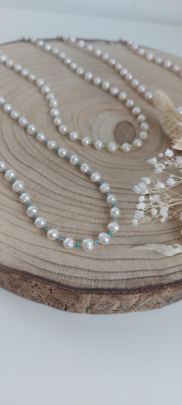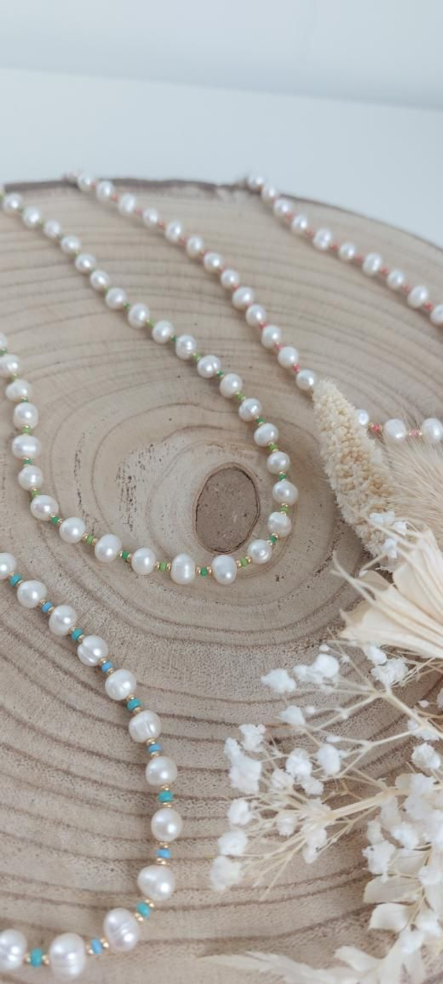 Collier en perles d'eau douce blanches et perles dorées et colorées.